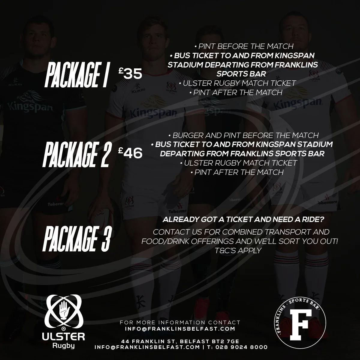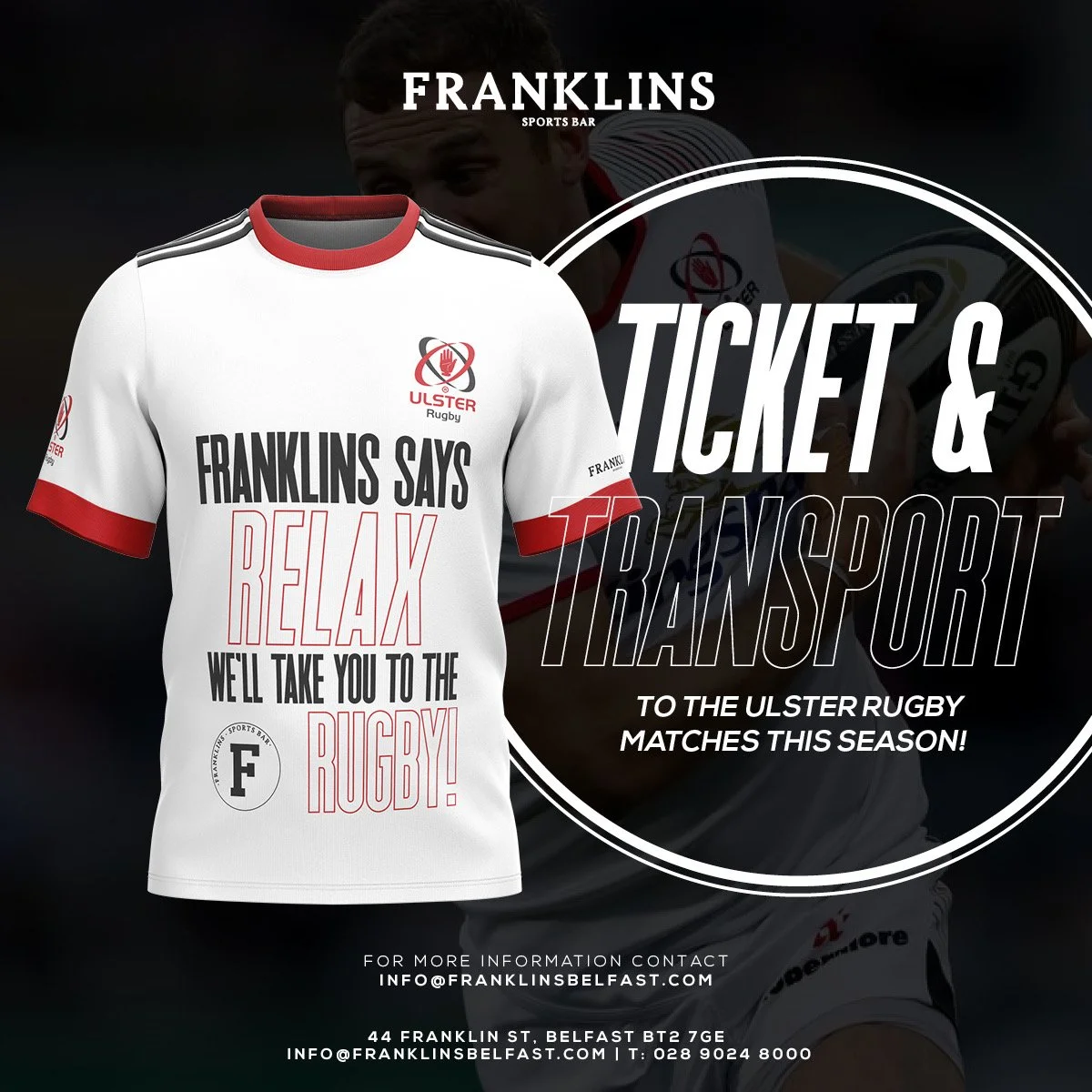 Our Ulster Rugby Ticket & Transport deals are back! Email info@franklinsbelfast.com to book your package now.